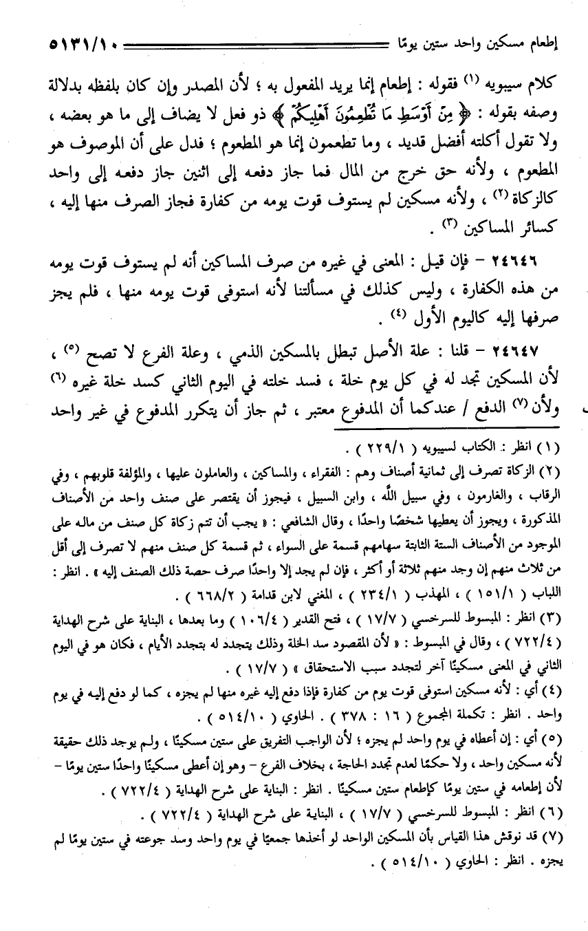 كلام سيبويه فقوله: إطعام إنما يريد المفعول به؛ لأن المصدر وإن كان بلفظه بدلالة وصفه بقوله: (من أوسط ما تطعمون أهليكم) ذو فعل لا يضاف إلى ما هو بعضه، ولا تقول أكلته أفضل قديد، وما تطعمون إنما هو المطعوم؛ فدل على أن الموصوف هو المطعوم، ولأنه حق خرج من المال فما جاز دفعه إلى اثنين جاز دفعه إلى واحد كالزكاة، ولأنه مسكين لم يستوف قوت يومه من كفارة فجاز الصرف منها إليه، كسائر المساكين.