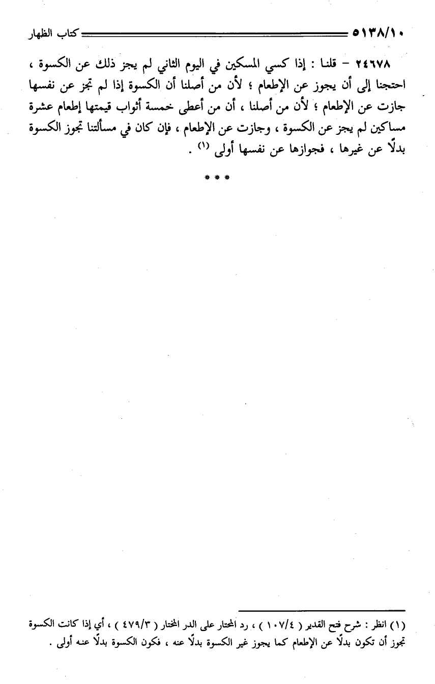 24678 - قلنا: إذا كسي المسكين في اليوم الثاني لم يجز ذلك عن الكسوة، احتجنا إلى أن يجوز عن الإطعام؛ لأن من أصلنا أن الكسوة إذا لم تجز عن نفسها جازت عن الإطعام؛ لأن من أصلنا، أن من أعطى خمسة أثواب قيمتها إطعام عشرة مساكين لم يجز عن الكسوة، وجازت عن الإطعام، فإن كان في مسألتنا تجوز الكسوة بدلًا عن غيرها، فجوازها عن نفسها أولى.