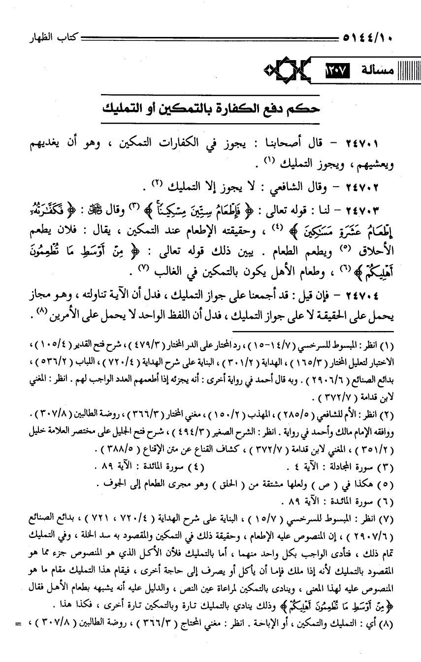 24701 - قال أصحابنا: يجوز في الكفارات التمكين، وهو أن يغديهم ويعشيهم، ويجوز التمليك.