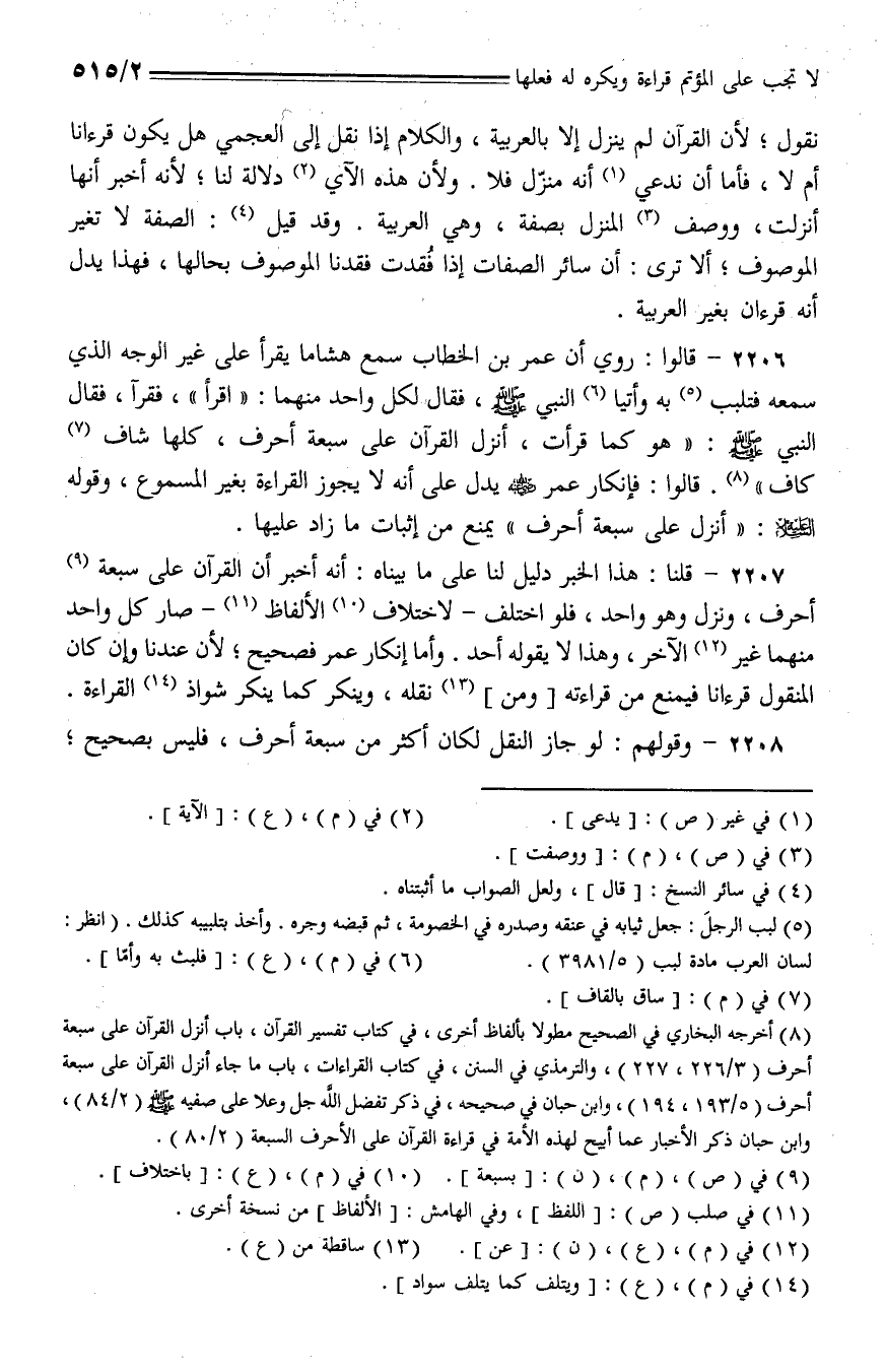 2206 - قالوا: روي أن عمر بن الخطاب سمع هشاما يقرأ على غير الوجه الذي سمعه فتلبب به وأتيا النبي - صلى الله عليه وسلم -، فقال لكل واحد منهما: (إقرأ)، فقرأ، فقال: النبي - صلى الله عليه وسلم -: (هو كما قرأت، أنزل القرآن على سبعة أحرف، كلها شاف كاف). قالوا: فإنكار عمر - رضي الله عنه - يدل على أنه لا يجوز القراءة بغير المسموع، وقوله - عليه السلام -: (أنزل على سبعة أحرف) يمنع من إثبات ما زاد عليها.