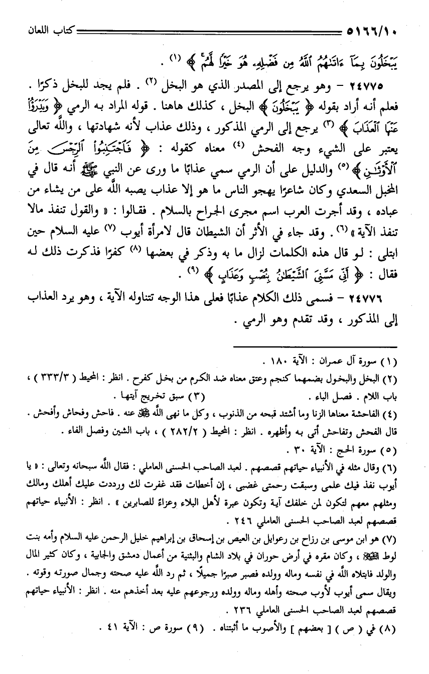 24775 - وهو يرجع إلى المصدر الذي هو البخل. فلم يجد للبخل ذكرًا. فعلم أنه أراد بقوله (يبخلون) البخل، كذلك هاهنا. قوله المراد به الرمي (ويدرؤا عنها العذاب) يرجع إلى الرمي المذكور، وذلك عذاب لأن شهادتها، والله تعالى يعتبر على الشيء وجه الفحش معناه كقوله: (فاجتنبوا الرجس من الأوثن) والدليل على أن الرمي سمي عذابًا ما روي عن النبي - صلى الله عليه وسلم - أنه قال في المخبل السعدي وكان شاعرًا يهجو الناس ما هو إلا عذاب يصبه الله على من يشاء من عباده، وقد أجرت العرب اسم مجرى الجراح بالسلام. فقالوا: (والقول تنفذ مالا تنفذ الآية). وقد جاء في الأثر أن الشيطان قال لامرأة أيوب عليه السلام حين ابتلي: لو قال هذه الكلمات لزال ما به وذكر في بعضها كفرًا فذكرت ذلك له فقال: (أني مسنى الشيطن بنصب وعذاب).