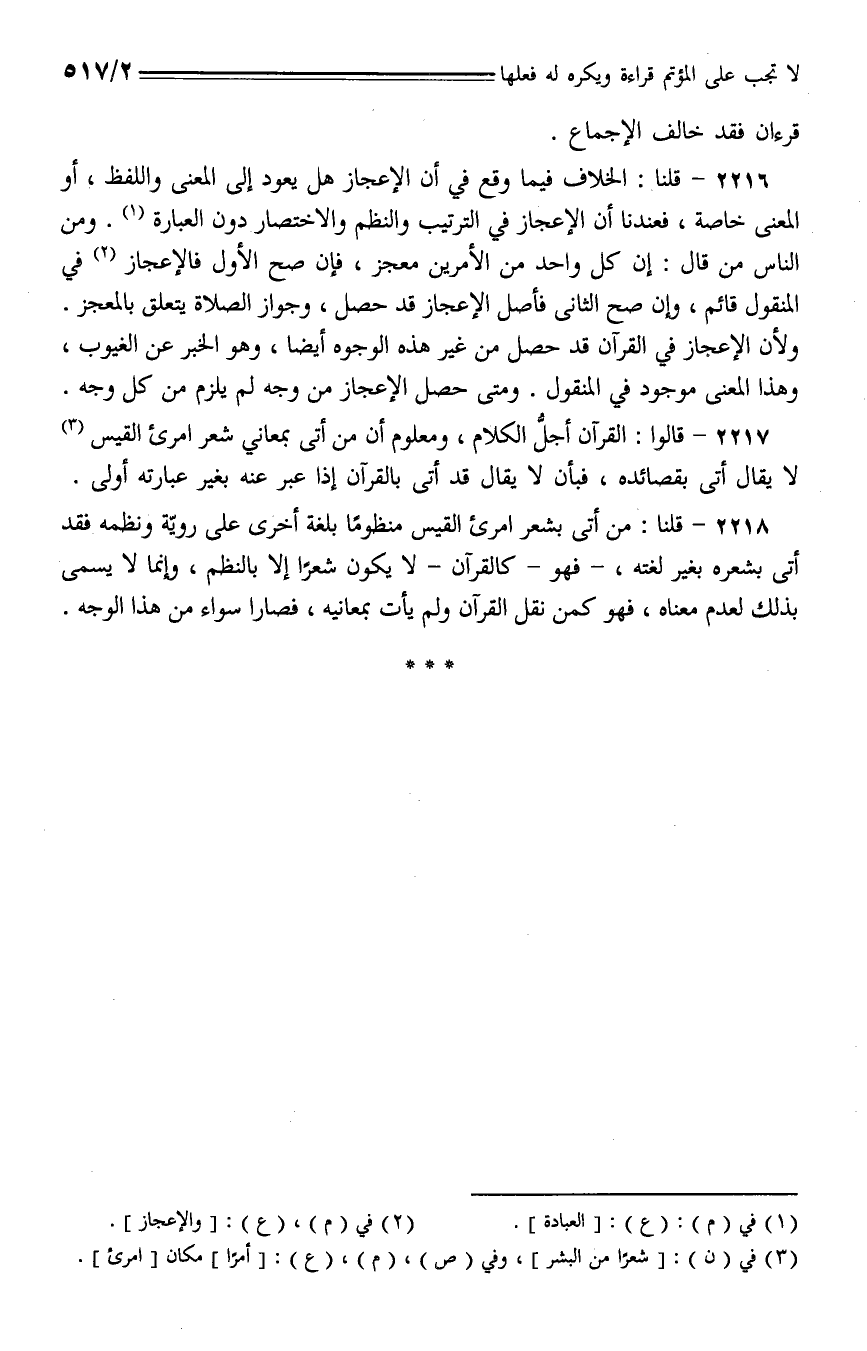 2218 - قلنا: من أتى بشعر امرئ القيس منظوما بلغة أخرى على روية ونظمه فقد أتى بشعر بغير لغته، - فهو- كالقرآن- لا يكون شعرا إلا بالنظم، وإنما لا يسمى بذلك لعدم معناه، فهو كمن نقل القرآن ولم يأت بمعانيه، فصارا سواء من هذا الوجه.