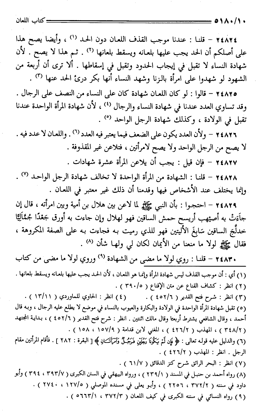 24825 - قالوا: لو كان اللعان شهادة كان على النساء من النصف على الرجال. وقد تساوى العدد عندنا في شهادة النساء والرجال، لأن شهادة المرأة الواحدة عندنا تقبل في الولادة، وكذلك شهادة الرجل الواحد.