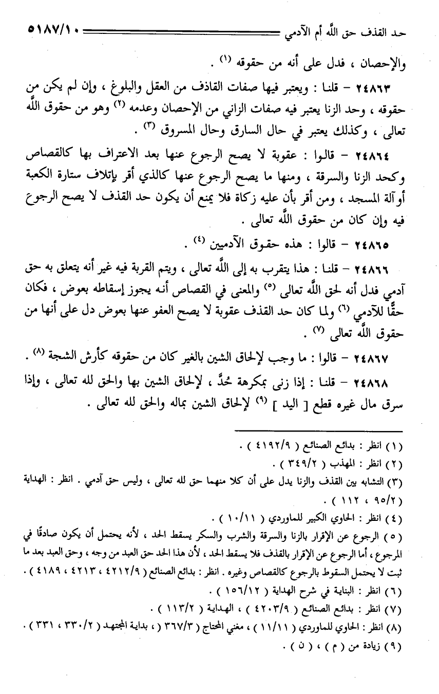24863 - قلنا: ويعتبر فيها صفات القاذف من العقل والبلوغ، وإن لم يكن من حقوقه، وحد الزنا يعتبر فيه صفات الزاني من الإحصان وعدمه وهو من حقوق الله تعالى، وكذلك يعتبر في حال السارق وحال المسروق.