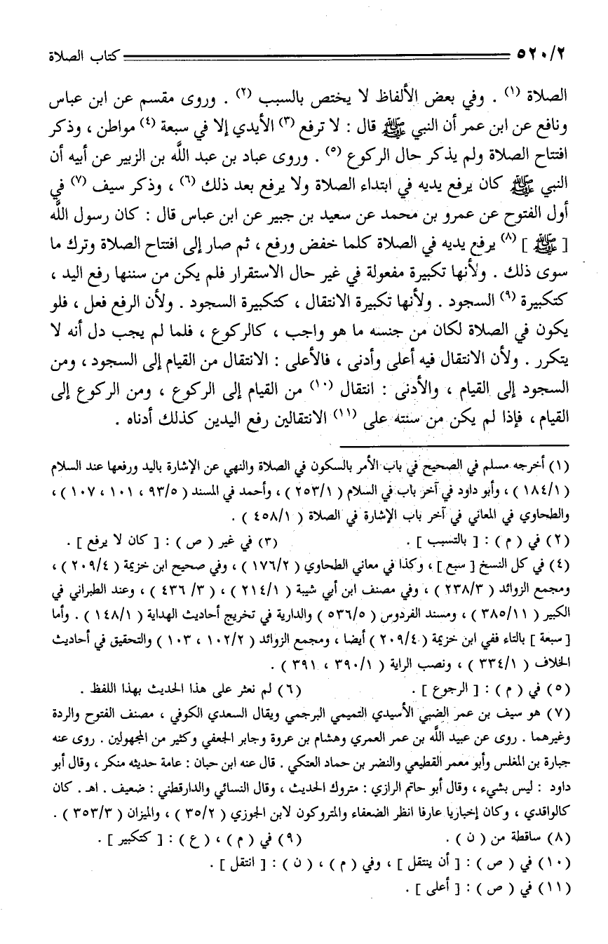 الصلاة. وفي بعض الألفاظ لا يختص بالسبب. وروى مقسم عن ابن عباس ونافع عن ابن عمر أن النبي - صلى الله عليه وسلم - قال: لا ترفع الأيدي إلا في سبعة مواطن، وذكر افتتاح الصلاة ولم يذكر حال الركوع. وروى عباد بن عبد الله بن الزبير عن أبيه أن النبي - صلى الله عليه وسلم - كان يرفع يديه في ابتداء الصلاة ولا يرفع بعد ذلك، وذكر سيف في أول الفتوح عن عمرو بن محمد عن سعيد بن جبير عن ابن عباس قال: كان رسول الله [- صلى الله عليه وسلم -] يرفع يديه في الصلاة كلما خفض ورفع، ثم صار إلى افتتاح الصلاة وترك ما سوى ذلك. ولأنها تكبيرة مفعولة في غير حال الاستقرار فلم يكن من سننها رفع اليد، كتكبيرة السجود. ولأنها تكبيرة الانتقال، كتكبيرة السجود. ولأن الرفع فعل، فلو يكون في الصلاة لكان من جنسه ما هو واجب، كالركوع، فلما لم يجب دل أنه لا يتكرر. ولأن الانتقال فيه أعلى وأدنى، فالأعلى: الانتقال من القيام إلى السجود، ومن السجود إلى القيام، والأدنى: انتقال من القيام إلى الركوع، ومن الركوع إلى القيام، فإذا لم يكن من سنته على الانتقالين رفع اليدين كذلك أدناه.