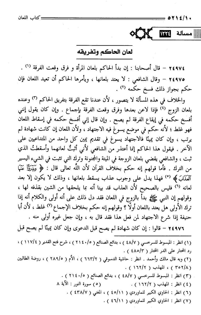 24975 - وقال الشافعي: لا يعتد بلعانها، ويأمرها الحاكم أن تعيد اللعان فإن حكم بجواز ذلك فسخ حكمه.