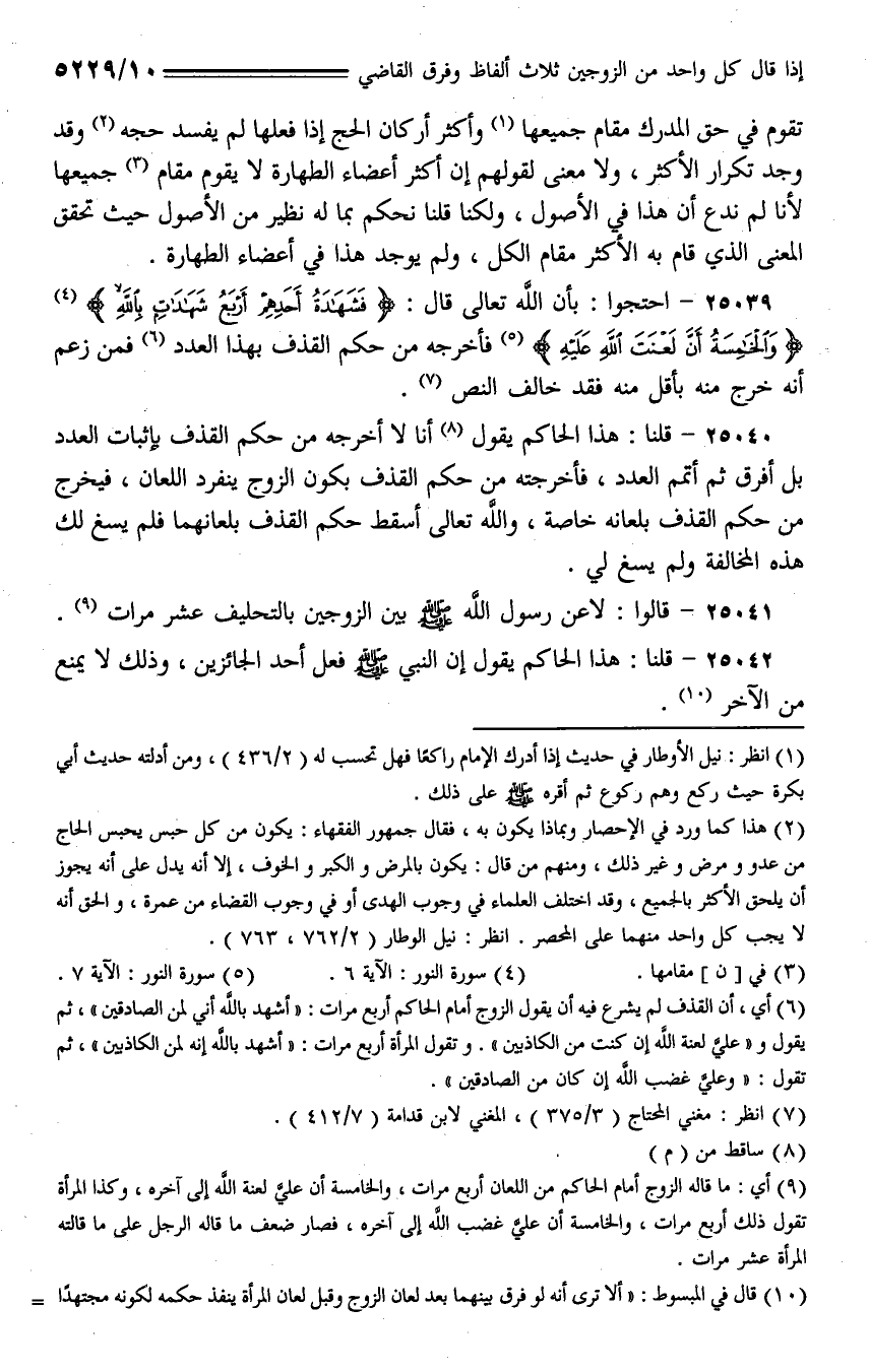 25039 - احتجوا: بأن الله تعالى قال: (فشهدة أحدهم أربع شهدت بالله) (والخمسة أن لعنت الله عليه) فأخرجه من حكم القذف بهذا العدد فمن زعم أنه خرج منه بأقل منه فقد خالف النص.