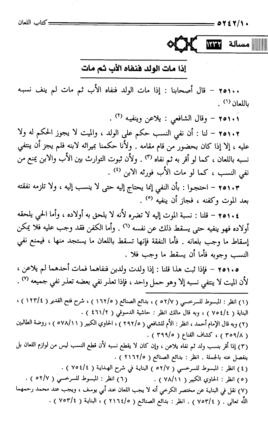 25104 - قلنا: نسبه الموت إليه لا تضره لأنه لا يلحق به أولاده، وأما الحي يلحقه أولاده فهو ينفيه حتى يسقط ذلك عن نفسه. وأما الكفن فقد وجب عليه فلا يمكن إسقاط ما وجب بلعانه. فأما النفقة فإنها تسقط باللعان ما يستجد منها، فيمنع نفي النسب وجوبه فأما أن يسقط ما وجب فلا.