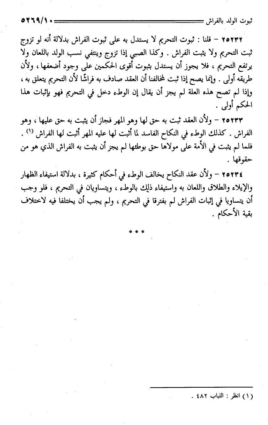 25232 - قلنا: ثبوت التحريم لا يستدل به على ثبوت الفراش بدلالة أنه لو تزوج ثبت التحريم ولا يثبت الفراش. وكذا الصبي إذا تزوج وينتفي نسب الولد باللعان ولا يرتفع التحريم، فلا يجوز أن يستدل بثبوت أقوى الحكمين على وجود أضعفها، ولأن طريقه أولى. وإنما يصح إذا ثبت لمخالفنا أن العقد صادف به فراشًا لأن التحريم يتعلق به، وإذا لم تصح هذه العلة لم يجز أن يقال إن الوطء دخل في التحريم فهو بإثبات هذا الحكم أولى.