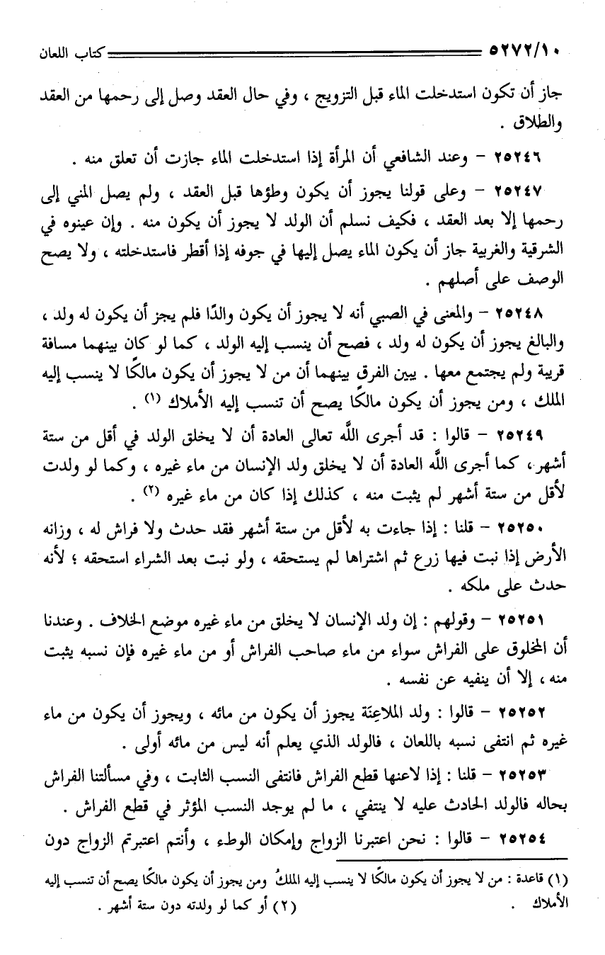 25251 - وقولهم: إن ولد الإنسان لا يخلق من ماء غيره موضع الخلاف. وعندنا أن المخلوق على الفراش سواء من ماء صاحب الفراش أو من ماء غيره فإن نسبه يثبت منه، إلا أن ينفيه عن نفسه.