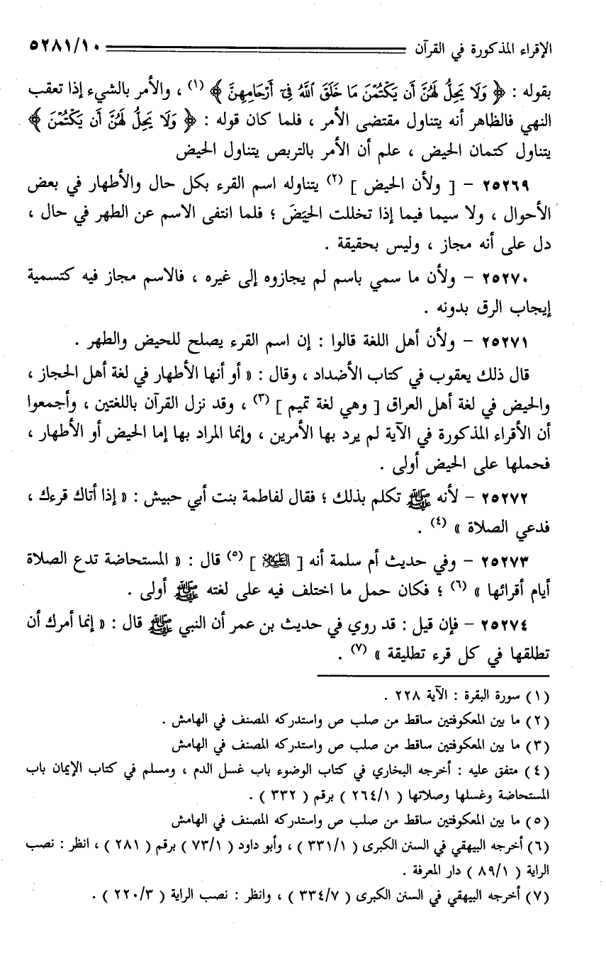 25273 - وفي حديث أم سلمة أنه [- عليه السلام -] قال: (المستحاضة تدع الصلاة أيام أقرائها)؛ فكان حمل ما اختلف فيه على لغته - صلى الله عليه وسلم - أولى.