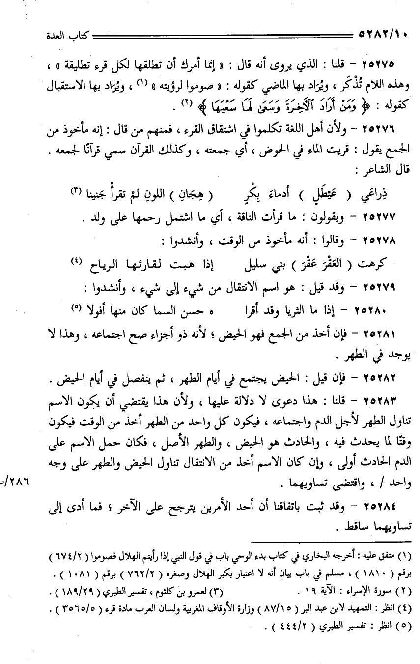 25276 - ولأن أهل اللغة تكلموا في اشتقاق القرء، فمنهم من قال: إنه مأخوذ من الجمع يقول: قريت الماء في الحوض، أي جمعته، وكذلك القرآن سمى قرآنا لجمعه. قال الشاعر: