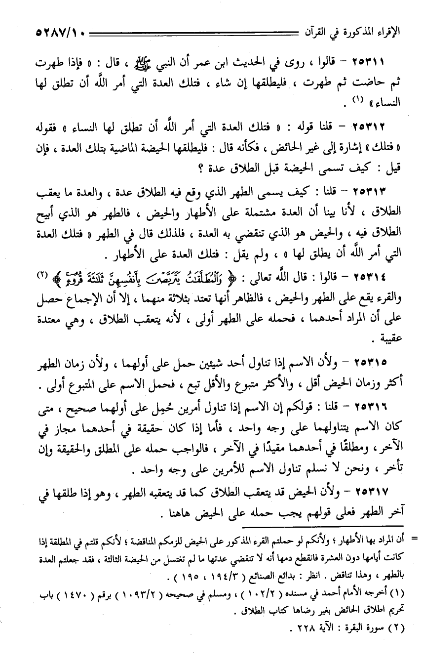 25311 - قالوا، ورى في الحديث ابن عمر أن النبي - صلى الله عليه وسلم -، قال: (فإذا طهرت ثم حاضت ثم طهرت، فليطقها إن شاء، فتلك العدة التي أمر الله أن تطلق لها النساء).