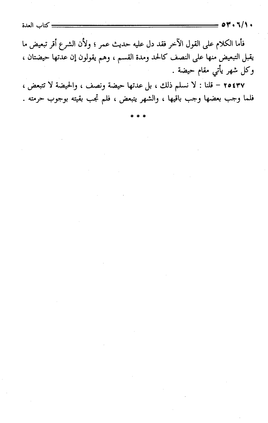 25437 - قلنا: لا نسلم ذلك، بل عدتها حيضة ونصف، والحيضة لا تتبعض، فلما وجب بعضها وجب باقيها، والشهر يتبعض، فلم تجب بقيته بوجوب حرمته.