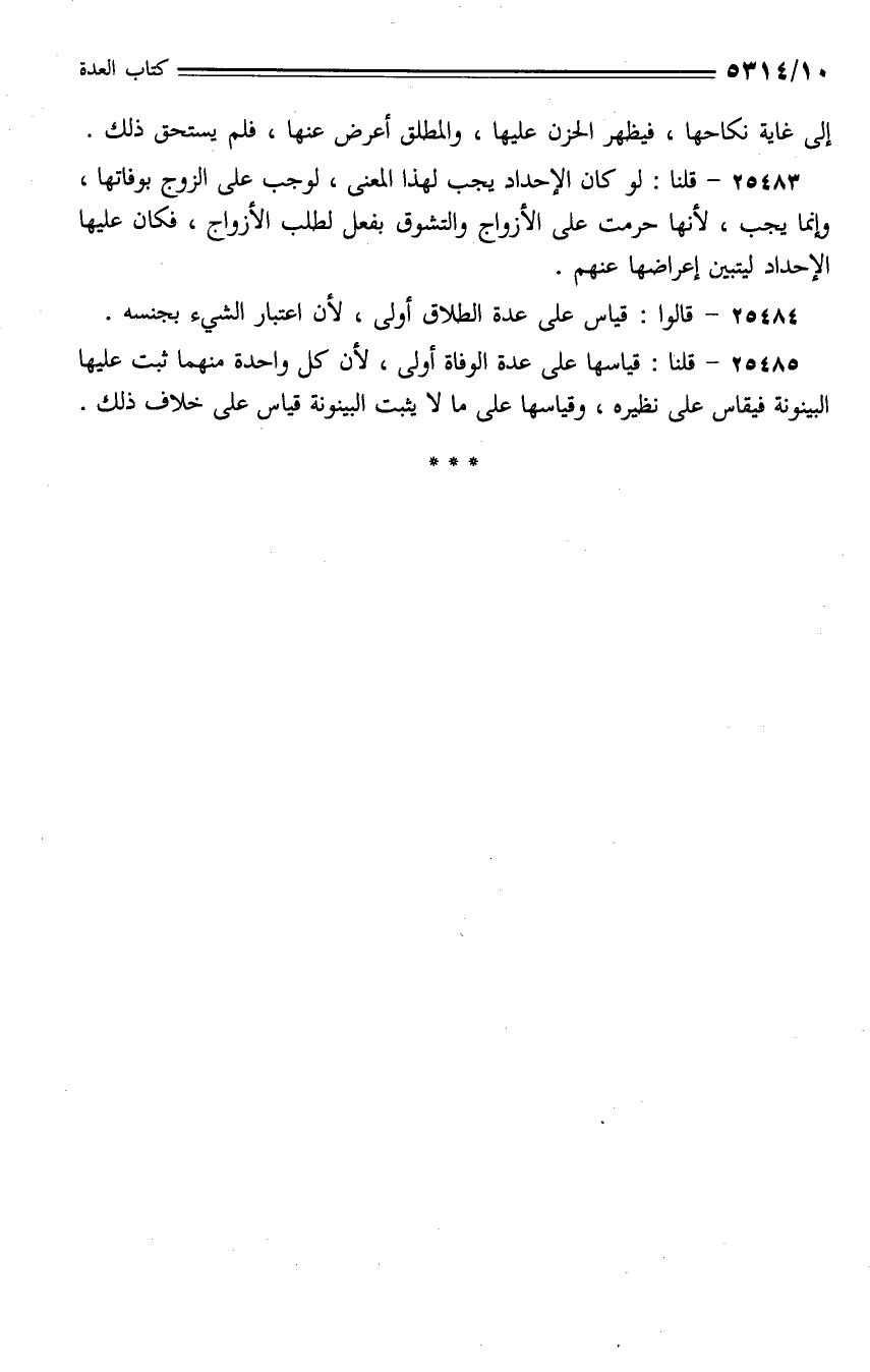 25485 - قلنا: قياسها على عدة الوفاة أولى، لأن كل واحدة منهما ثبت عليها البينونة فيقاس على نظيره، وقياسها على ما لا يثبت البينونة قياس على خلاف ذلك.