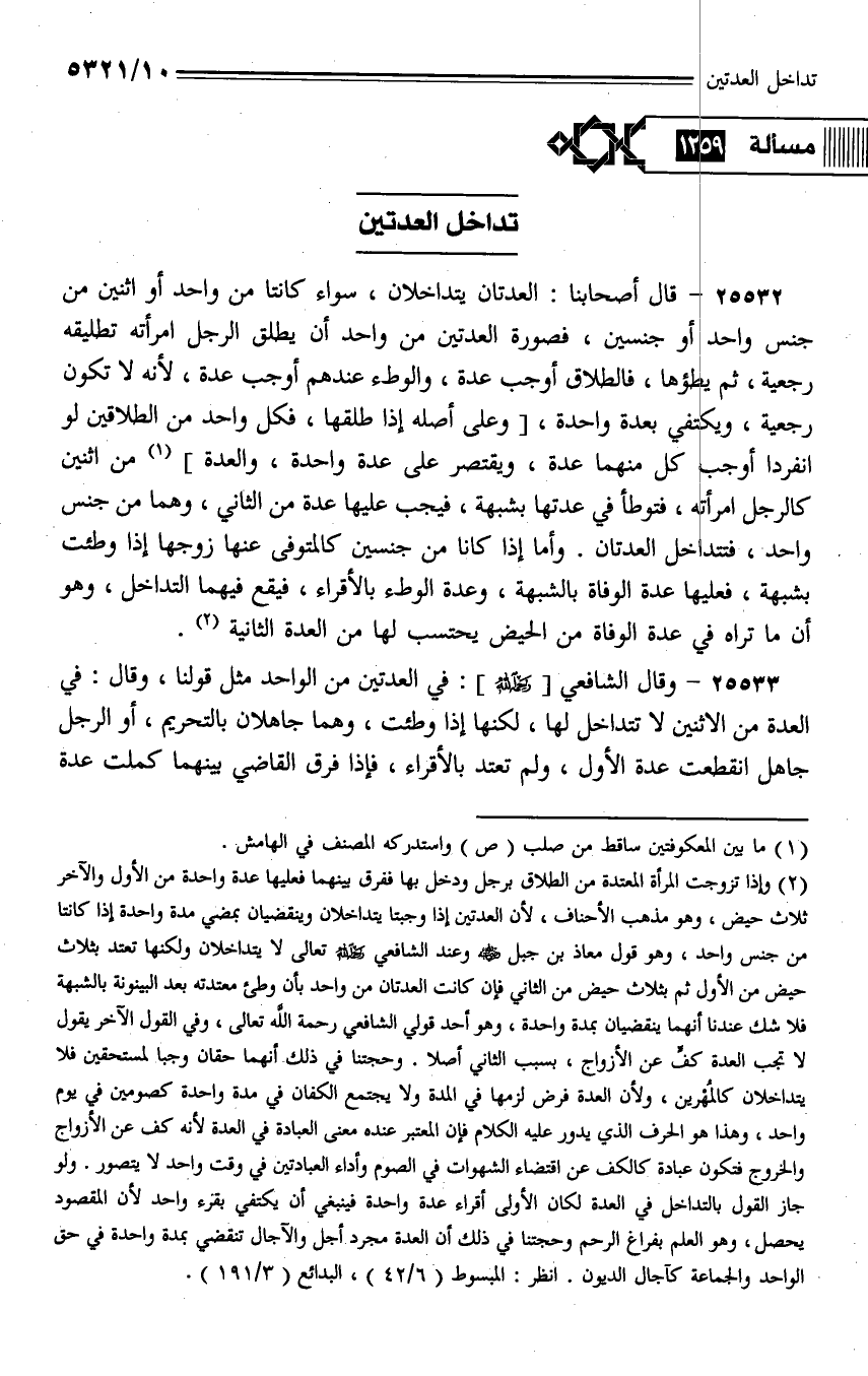 25532 - قال أصحابنا: العدتان يتداخلان، سواء كانتا من واحد أو اثنين من جنس واحد أو جنسين، فصورة العدتين من واحد أن يطلق الرجل امرأته تطليقة رجعية، ثم يطؤها، فالطلاق أوجب عدة، والوطء عندهم أوجب عدة، لأنه لا تكون رجعية، ويكتفى بعدة واحدة، [وعلى أصله إذا طلقها، فكل واحد من الطلاقين لو انفردا أوجب كل منهما عدة، ويقتصر على عدة واحدة، والعدة] من اثنين كالرجل امرأته، فتوطأ في عدتها بشبهة، فيجب عليها عدة من الثاني، وهما من جنس واحد، فتتداخل العدتان. وأما إذا كانا من جنسين كالمتوفى عنها زوجها إذا وطئت بشبهة، فعليها عدة الوفاة بالشبهة، وعدة الوطء بالأقراء، فيقع فيهما التداخل، وهو أن ما تراه في عدة الوفاة من الحيض يحتسب لها من العدة الثانية.