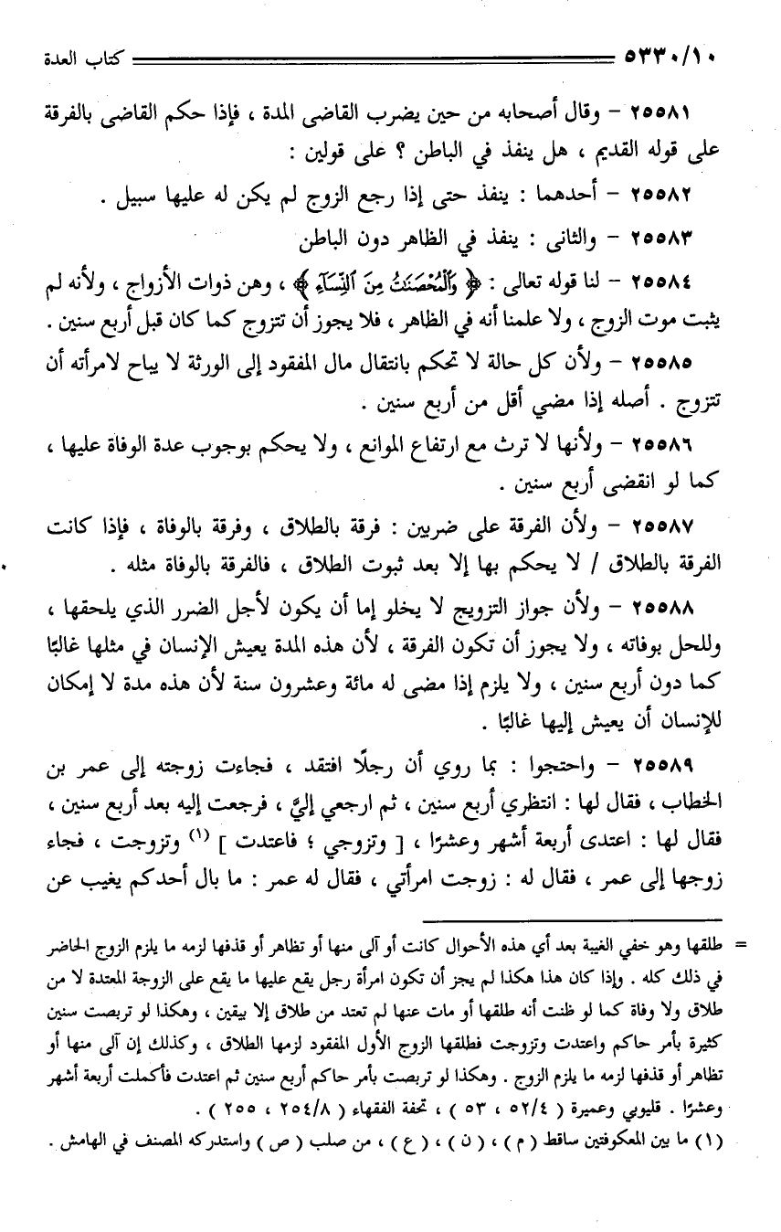 25586 - ولأنها لا ترث مع ارتفاع الموانع، ولا يحكم بوجوب عدة الوفاة عليها، كما لو انقضى أربع سنين.