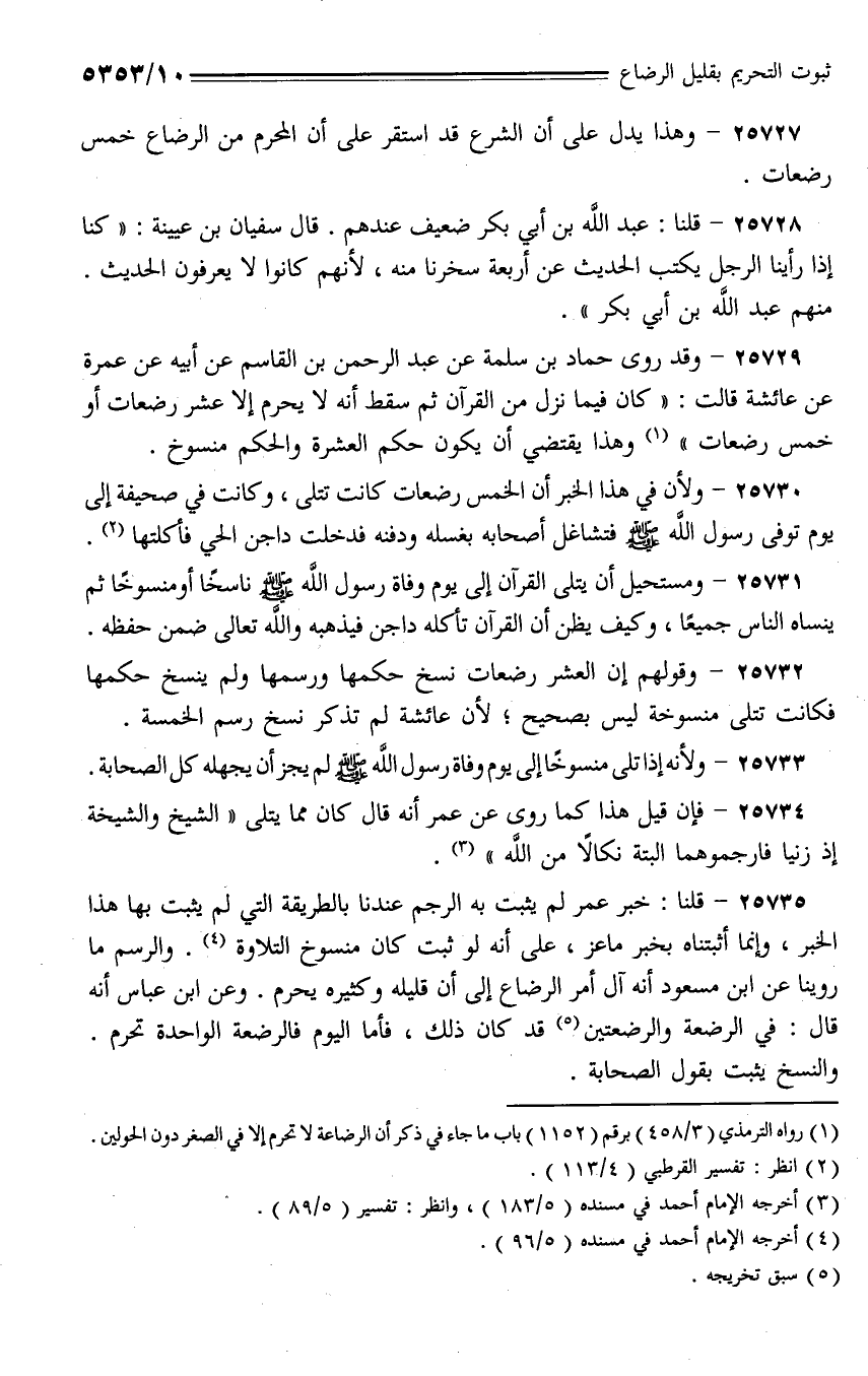 25732 - وقولهم إن العشر رضعات نسخ حكمها ورسمها ولم ينسخ حكمها فكانت تتلى منسوخة ليس بصحيح؛ لأن عائشة لم تذكر نسخ رسم الخمسة.