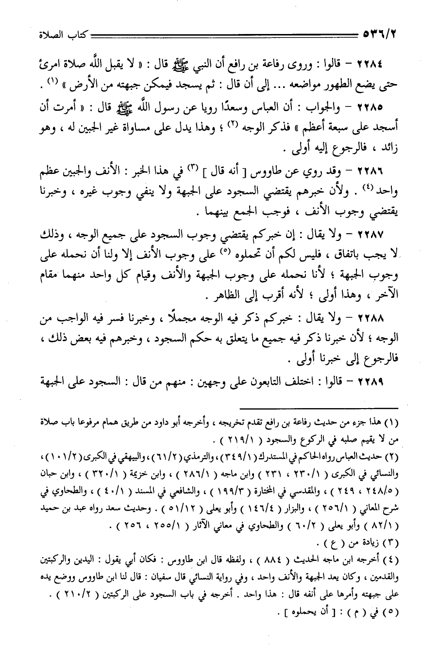 2284 - قالوا: وروى رفاعة بن رافع أن النبي - صلى الله عليه وسلم - قال: (لا يقبل الله صلاة امرئ حتى يضع الطهور مواضعه ... إلى أن قال: ثم يسجد فيمكن جبهته من الأرض).