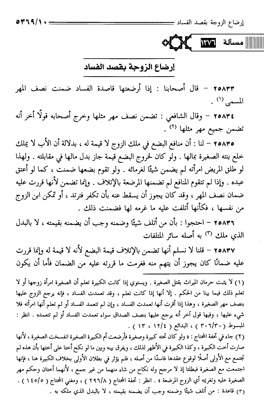 25834 - وقال الشافعي: تضمن نصف مهر مثلها وخرج أصحابه قولًا أخر أنه يضمن جميع مهر مثلها.