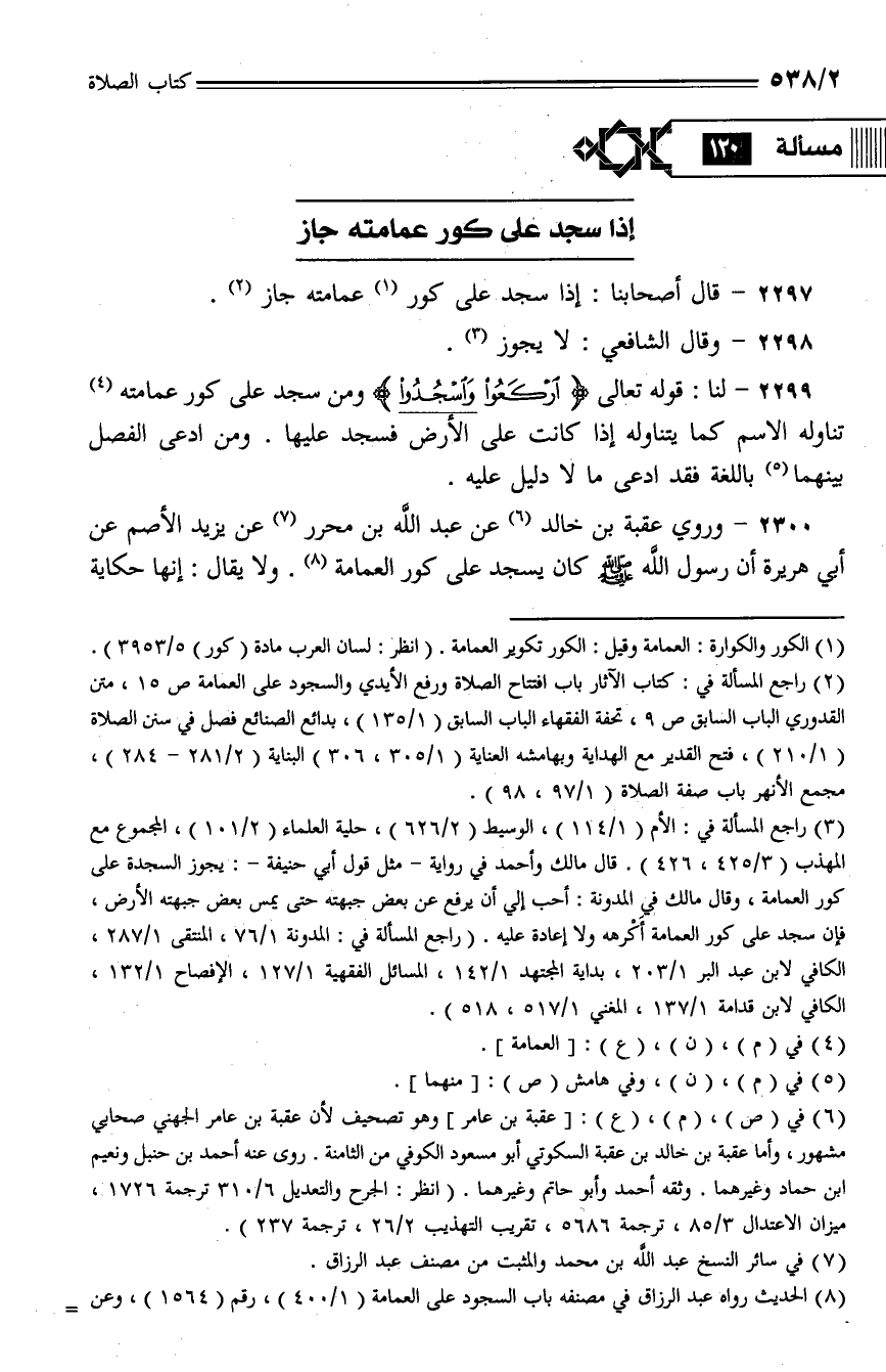 2300 - وروي عقبة بن خالد عن عبد الله بن محرر عن يزيد الأصم عن أبي هريرة أن رسول الله - صلى الله عليه وسلم - كان يسجد على كور العمامة. ولا يقال: إنها الحكاية