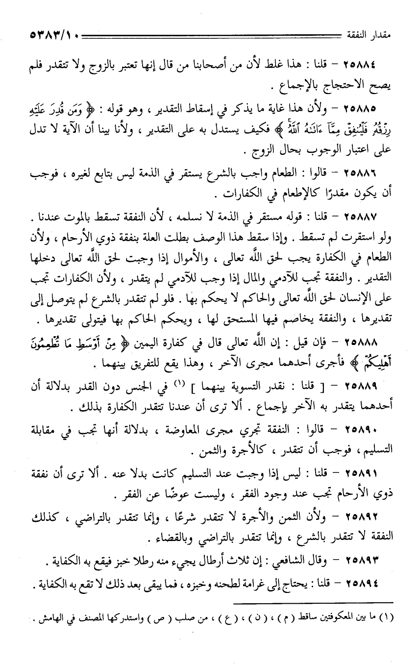 25887 - قلنا: قوله مستقر في الذمة لا نسلمه، لأن النفقة تسقط بالموت عندنا. ولو استقرت لم تسقط. وإذا سقط هذا الوصف بطلت العلة بنفقة ذوي الأرحام، ولأن الطعام في الكفارة يجب لحق الله تعالى، والأموال إذا وجبت لحق الله تعالى دخلها التقدير. والنفقة تجب للآدمي والمال إذا وجب للآدمي لم يتقدر، ولأن الكفارات تجب على الإنسان لحق الله تعالى والحاكم لا يحكم بها. فلو لم تتقدر بالشرع لم يتوصل إلى تقديرها، والنفقة يخاصم فيها المستحق لها، ويحكم الحاكم بها فيتولى تقديرها.