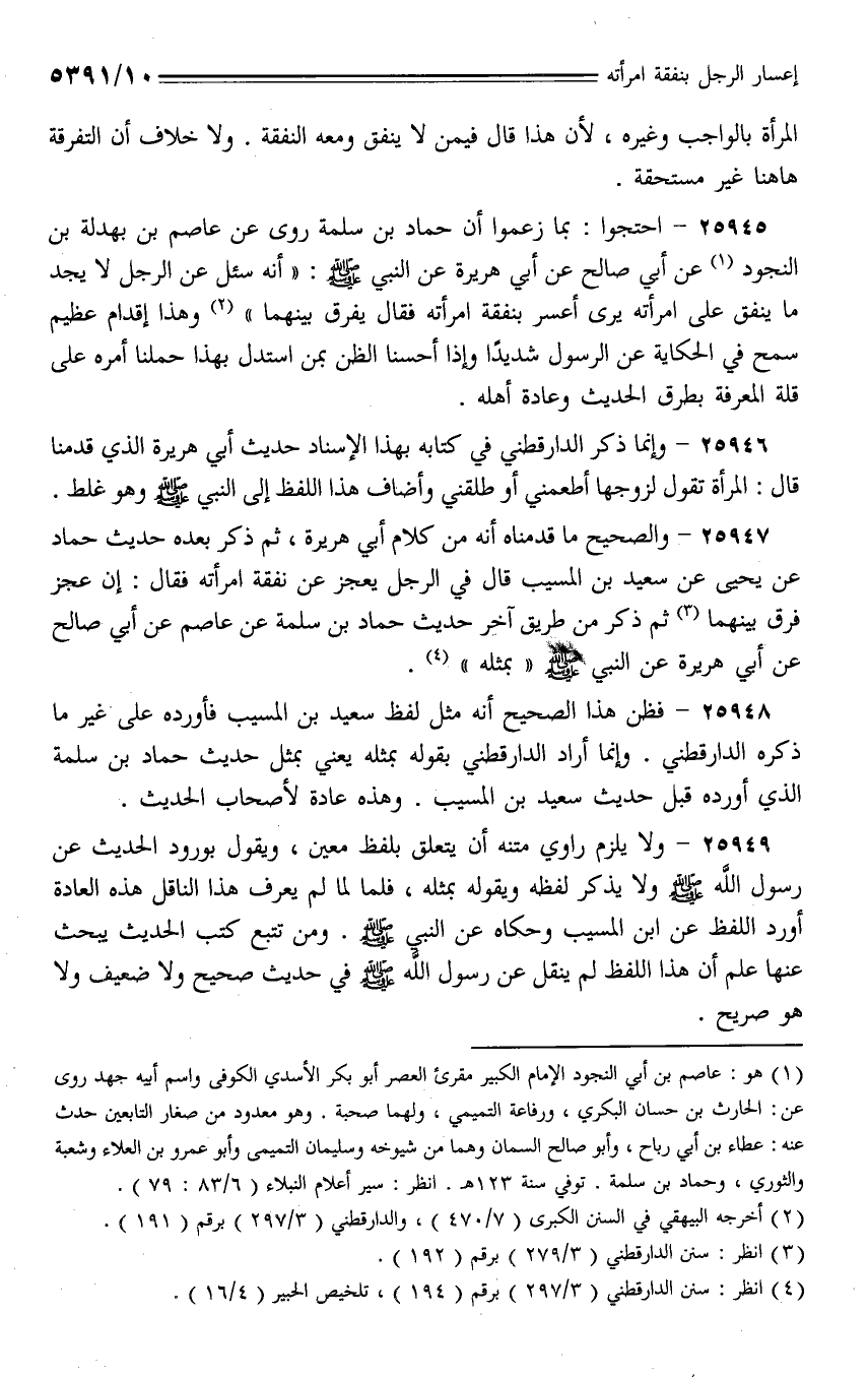 25945 - احتجوا: بما زعموا أن حماد بن سلمة روى عن عاصم بن بهدلة بن النجود عن أبي صالح عن أبي هريرة عن النبي - صلى الله عليه وسلم -: (إنه سئل عن الرجل لا يجد ما ينفق على امرأته يرى أعسر بنفقة امرأته فقال يفرق بينهما) وهذا إقدام عظيم سمح في الحكاية عن الرسول شديدًا وإذا أحسنا الظن بمن استدل بهذا حملنا أمره على قلة المعرفة بطرق الحديث وعادة أهله.