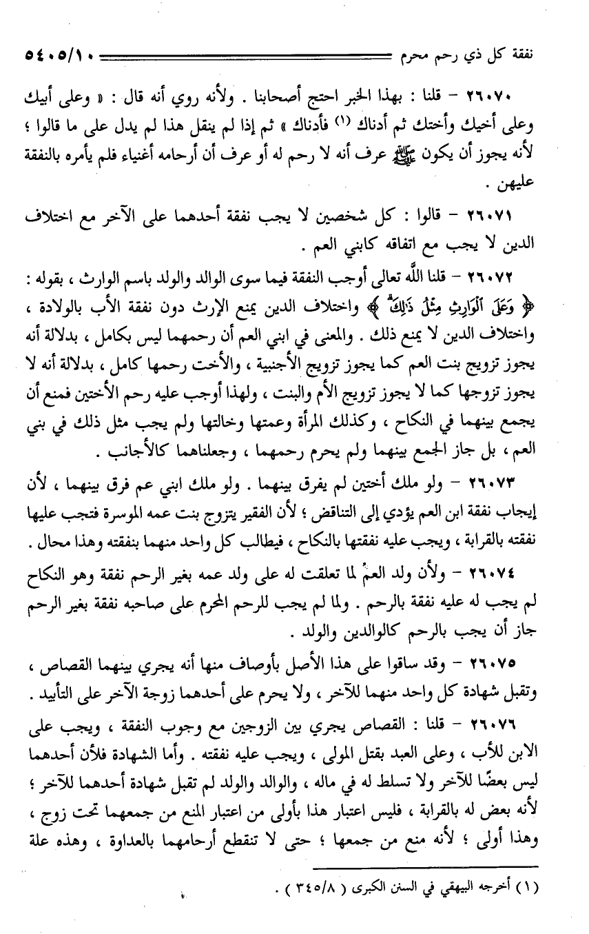 26074 - ولأن ولد العم لما تعلقت له على ولد عمه بغير الرحم نفقة وهو النكاح لم يجب له عليه نفقة بالرحم. ولما لو يجب للرحم المحرم على صاحبه نفقة بغير الرحم جاز أن يجب بالرحم كالوالدين والولد.