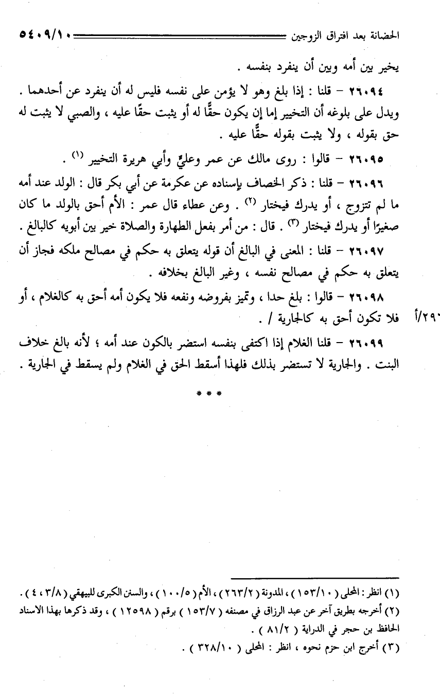 26094 - قلنا: إذا بلغ وهو لا يؤمن على نفسه فليس له أن ينفرد عن أحدهما. ويدل على بلوغه أن التخيير إما إن يكون حقًا له أو يثبت حقًا عليه، والصبي لا يثبت له حق بقوله، ولا يثبت بقوله حقًا عليه.