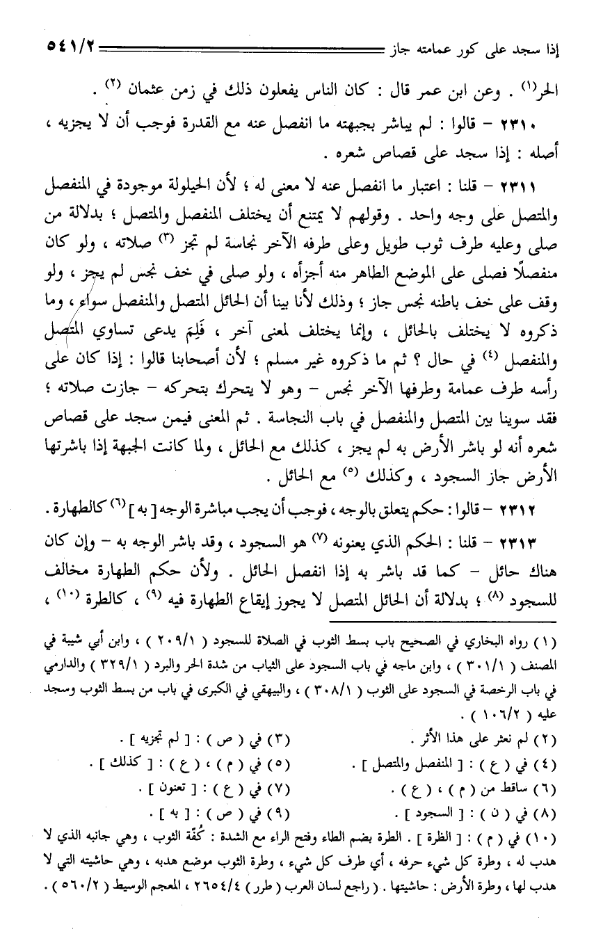 2311 - قلنا: اعتبار ما انفصل عنه لا معنى له؛ لأن الحيلولة موجودة في المنفصل والمتصل على وجه واحد. وقولهم لا يمتنع أن يختلف المنفصل والمتصل؛ بدلالة من صلى وعليه طرف ثوب طويل وعلى طرفه الآخر نجاسة لم تجز صلاته، ولو كان منفصلا فصلى على الموضع الطاهر منه أجزأه، ولو صلى في خف نجس لم يجز، ولو وقف على خف باطنه نجس جاز؛ وذلك لأنا بينا أن الحائل المتصل والمنفصل سواء، وما ذكروه لا يختلف بالحائل، وإنما يختلف لمعنى آخر، فلم يدعى تساوي المتصل والمنفصل في حال؟ ثم ما ذكروه غير مسلم؛ لأن أصحابنا قالوا: إذا كان على رأسه طرف عمامة وطرفها الآخر نجس- وهو لا يتحرك بتحركه- جازت صلاته؛ فقد سوينا بين المتصل والمنفصل في باب النجاسة. ثم المعنى فيمن سجد على قصاص شعره أنه لو باشر الأرض به لم يجز، وكذلك مع الحائل، ولما كانت الجبهة إذا باشرتها الأرض جاز السجود، وكذلك مع الحائل.
