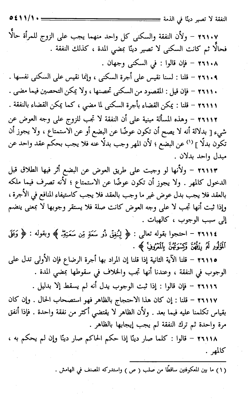26107 - ولأن النفقة والسكنى كل واحد منهما يجب على الزوج للمرأة حالًا فحالًا ثم كانت السكنى لا تصير دينًا بمضي المدة، كذلك النفقة.