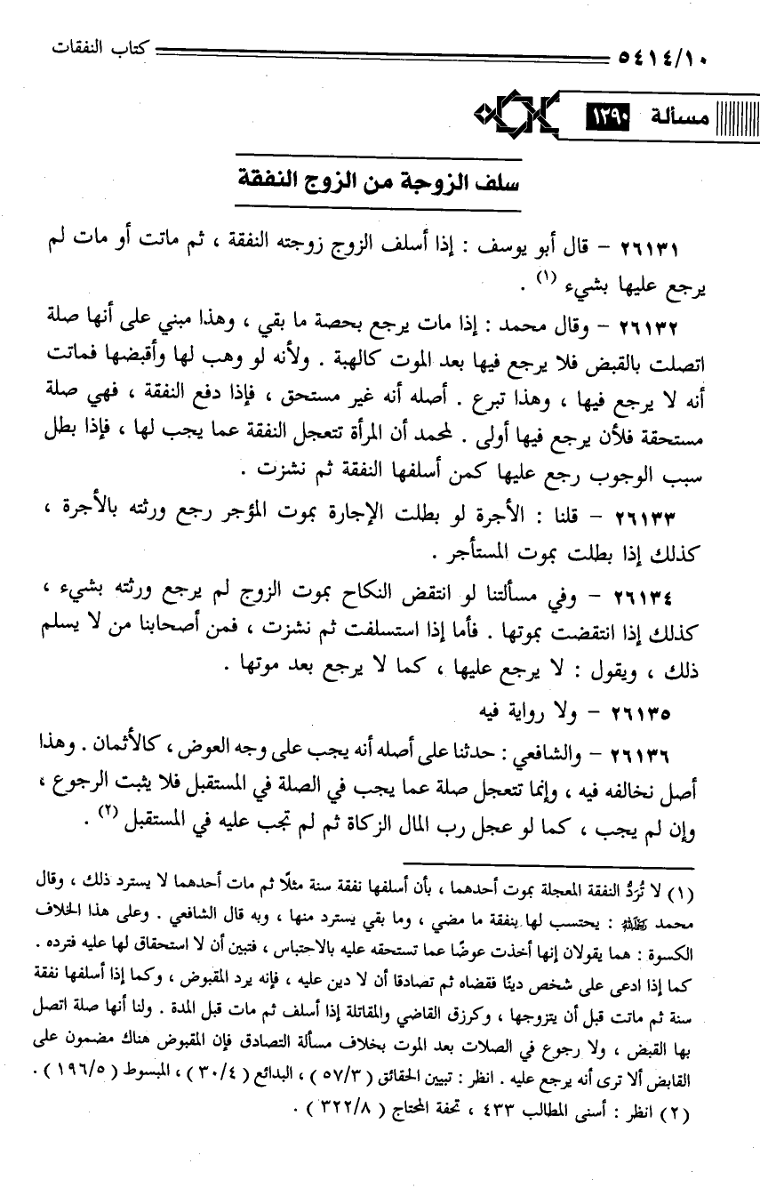 26131 - قال أبو يوسف: إذا أسلف الزوج زوجته النفقة، ثم ماتت أو مات لم يرجع عليها بشيء.
