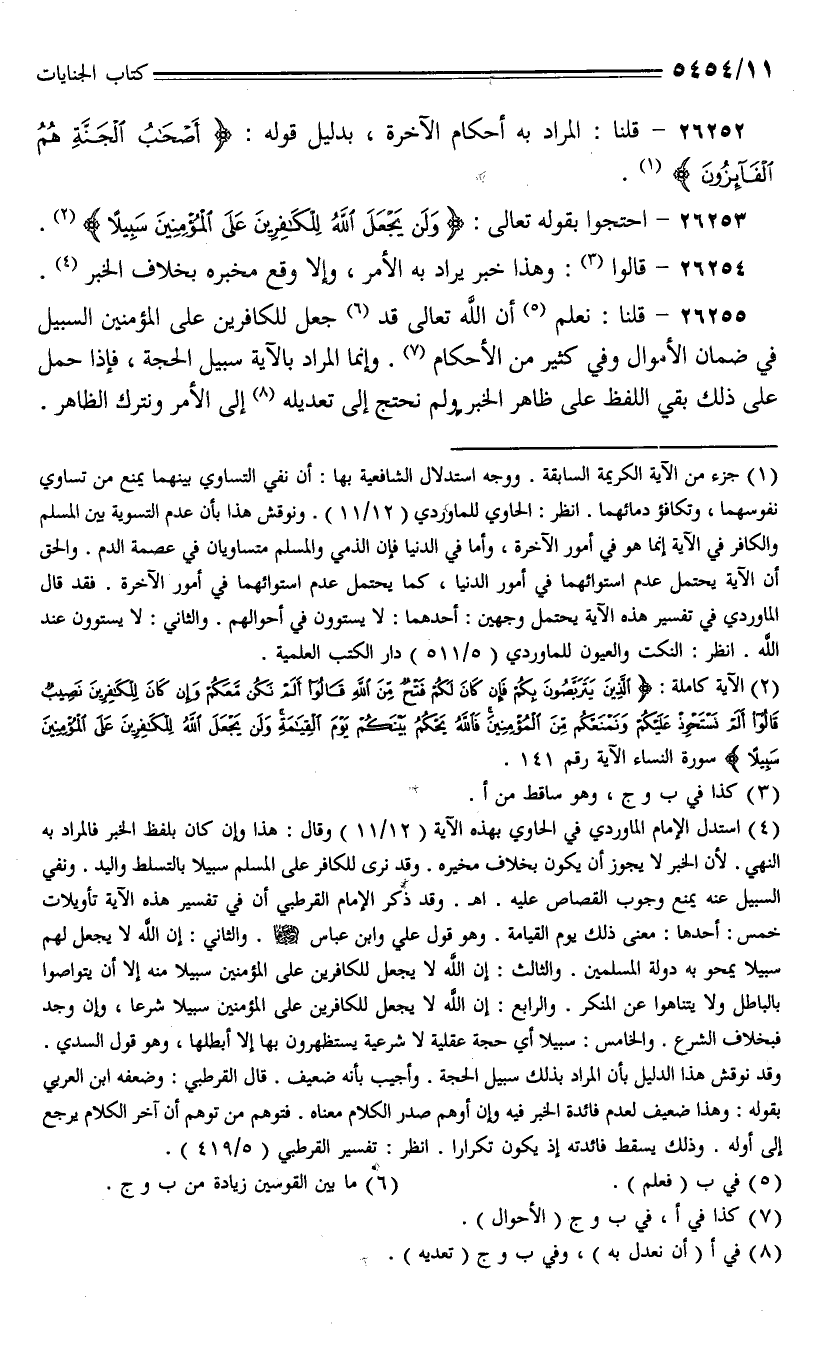 26255 - قلنا: نعلم أن الله تعالى قد جعل للكافرين على المؤمنين السبيل في ضمان الأموال وفي كثير من الأحكام. وإنما المراد بالآية سبيل الحجة، فإذا حمل على ذلك بقي اللفظ على ظاهر الخبر ولم نحتج إلى تعديله إلى الأمر ونترك الظاهر.