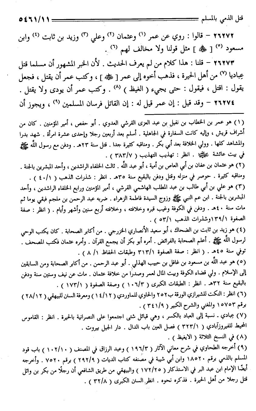 26273 - قلنا: هذا كلام من لم يعرف الحديث. لأن الخبر المشهور أن مسلمًا قتل عباديًا من أهل الحيرة، فذهب أخوه إلى عمر [- رضي الله عنه -]، وكتب عمر أن يقتل، فجعل يقول: أقتل، فيقول: حتى يجئ (الغيظ). وكتب عمر أن يودى ولا يقتل.