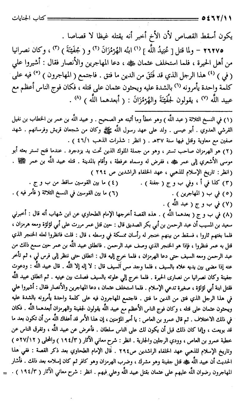 26275 - ولما قتل [عبيد الله] ابنه الهرمزان و (جفينه)، وكان نصرانيًا من أهل الحيرة، فلما استخلف عثمان [- رضي الله عنه -]، دعا المجاهرين والأنصار فقال: أشيروا علي في هذا الرجل الذي قد فتق من الدين ما فتق. فاجتمع (المهاجرون) فيه على كلمة واحدة يأمرونه بالشدة عليه ويحثون عثمان على قتله، فكان فوج الناس أعظم مع عبيد الله، يقولون لجفينة والهرمزان: (أبعدهما الله).