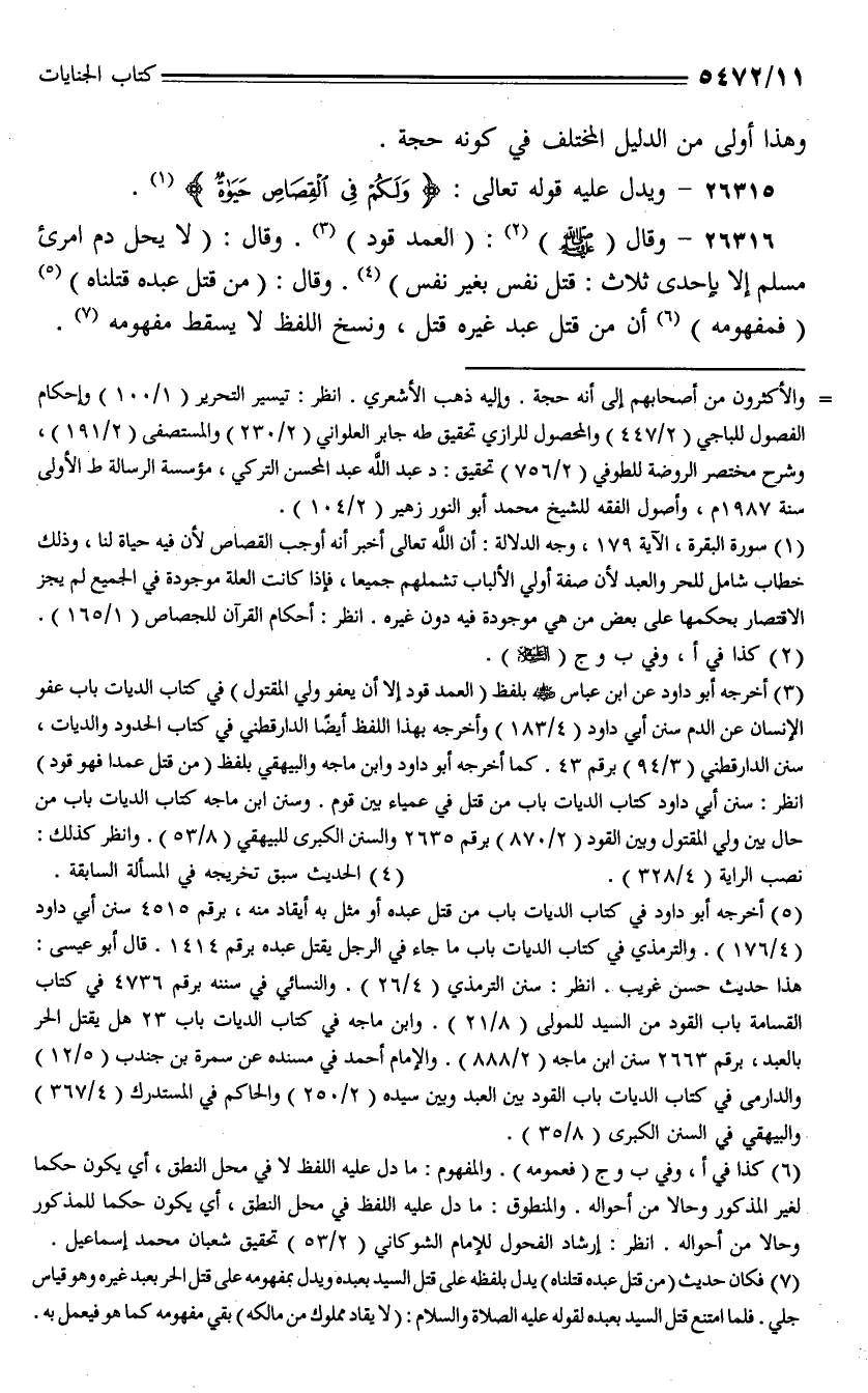 26316 - وقال (- صلى الله عليه وسلم -): (العمد قود). وقال: (لا يحل دم امرئ مسلم إلا بإحدى ثلاث: قتل نفس بغير نفس). وقال: (من قتل عبده قتلناه) (فمفهومه) أن من قتل عبد غيره قتل، ونسخ اللفظ لا يسقط مفهومه.
