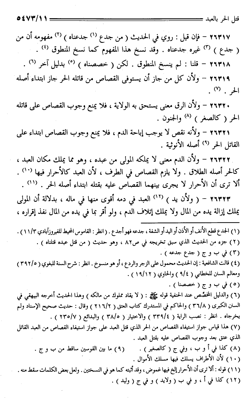 26322 - ولأن الدم معنى لا يملكه المولى من عبده، وهو مما يملك مكان العبد، كالحر أصله الطلاق. ولا يلزم القصاص في الطرف، لأن العبد كالأحرار فيها. ألا ترى أن الأحرار يجري بينهما القصاص عليه بقتله ابتداء أصله الحر.