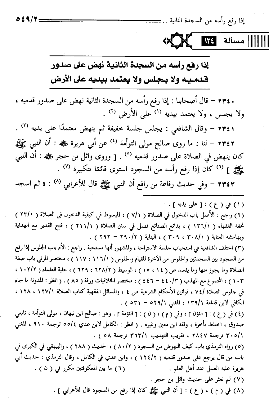 2340 - قال أصحابنا: إذا رفع رأسه من السجدة الثانية نهض على صدور قدميه، ولا يجلس، ولا يعتمد بيديه على الأرض.