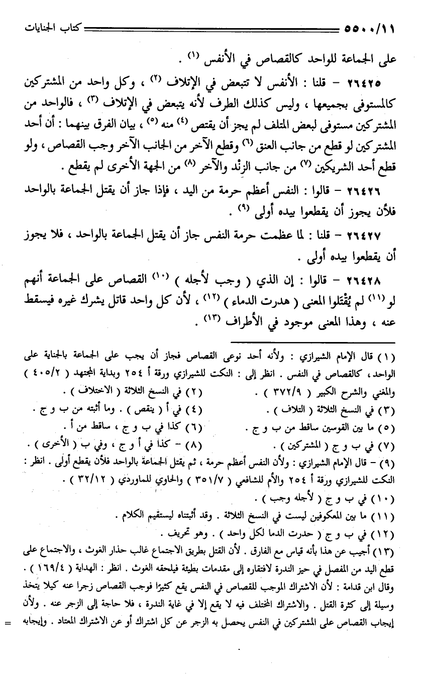 26428 - قالوا: إن الذي (وجب لأجله) القصاص على الجماعة أنهم لو لم يقتلوا المعنى (هدرت الدماء)، لأن كل واحد قاتل يشرك غيره فيسقط عنه، وهذا المعنى موجود في الأطراف.
