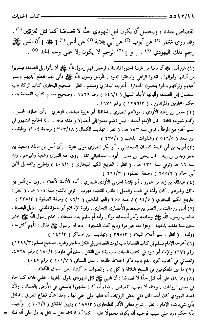 القصاص عندنا، ويحتمل أن يكون قتل اليهودي حدًا لا قصاصًا كما قتل العُربيين. وقد روى معمر عن أيوب عن أبي قلابة عن أنس [- رضي الله عنه -] أن النبي - صلى الله عليه وسلم - رجم ذلك اليهودي. [و] الرجم لا يكون إلا على وجه الحد.