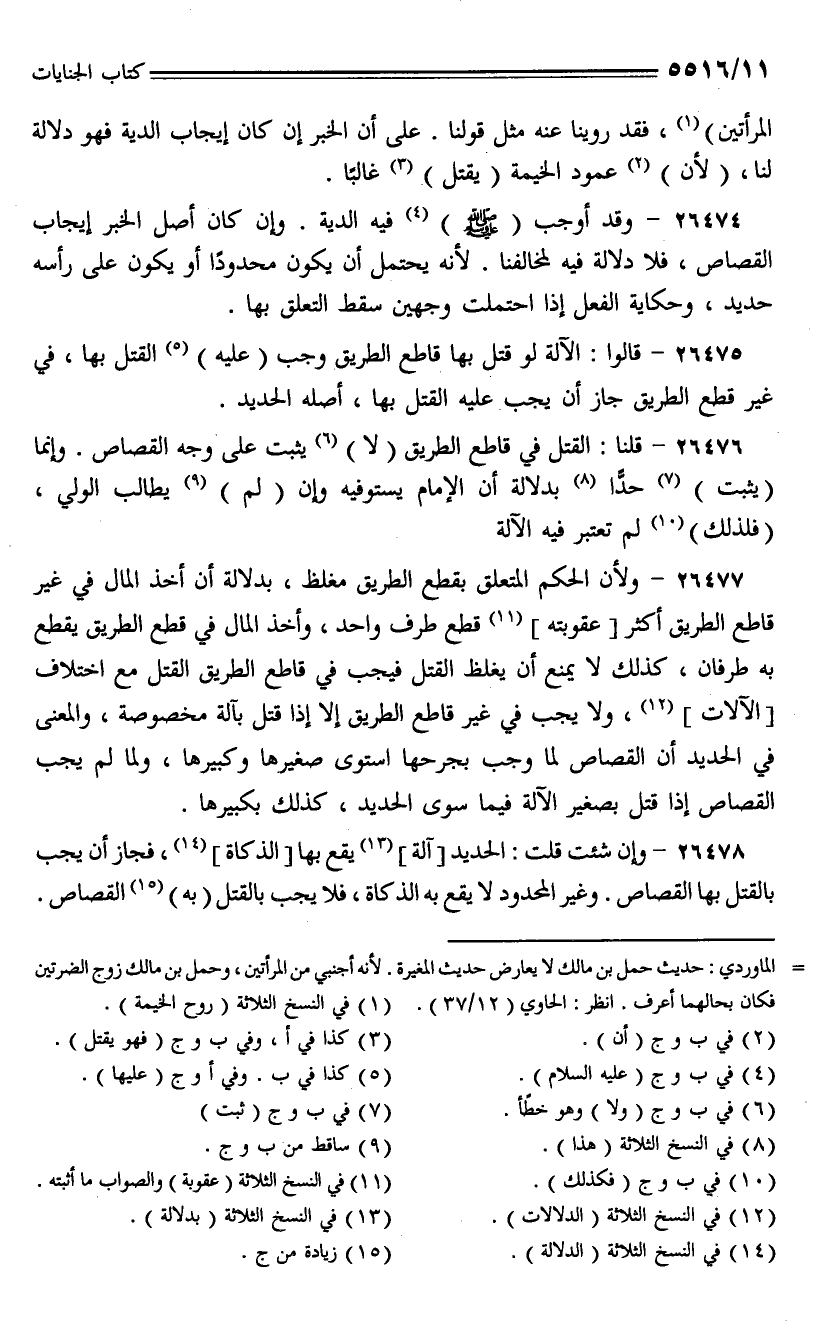 26375 - قالوا: الآلة لو قتل بها قاطع الطريق وجب (عليه) القتل بها، في غير قطع الطريق جاز أن يجب عليه القتل بها، أصله الحديد.