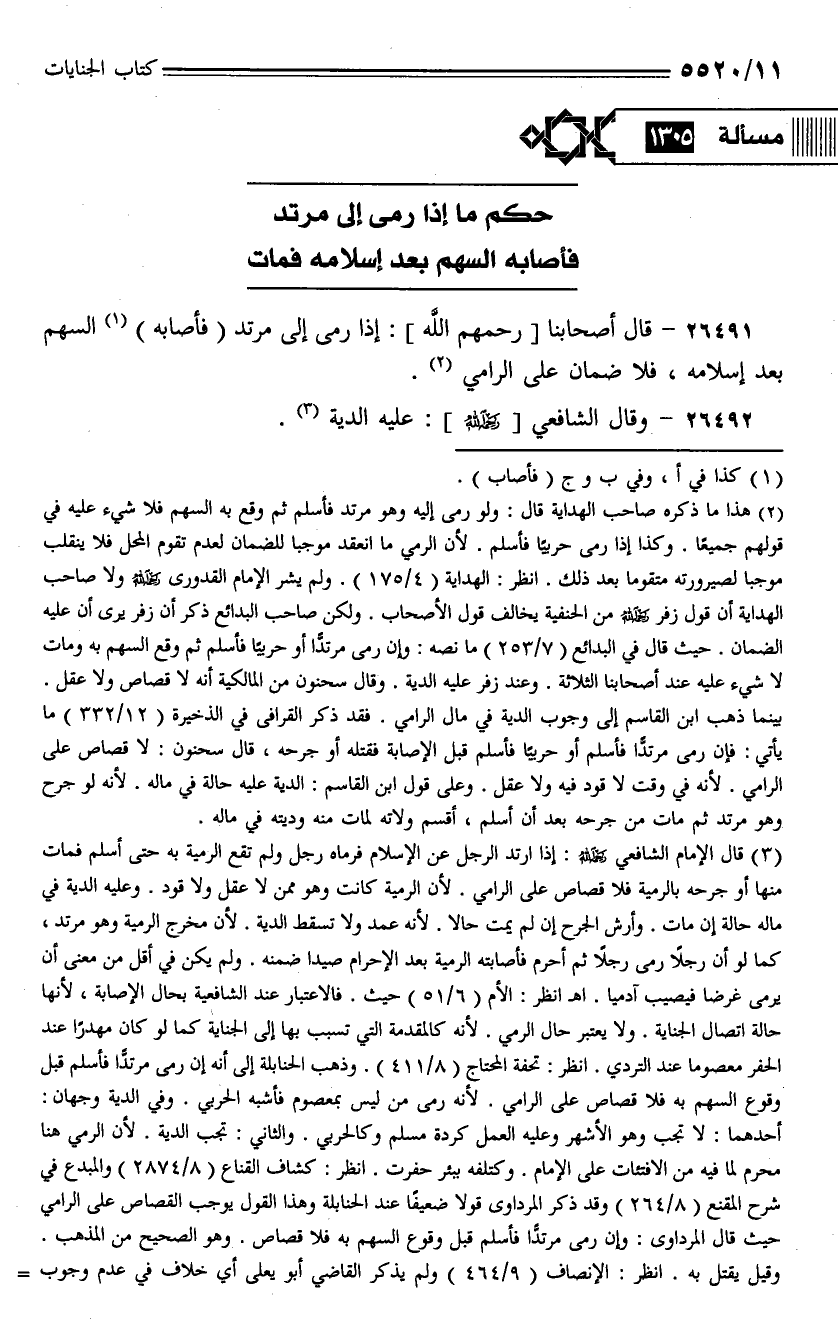 26491 - قال أصحابنا [رحمهم الله]: إذا رمى إلى مرتد (فأصابه) السهم بعد إسلامه، فلا ضمان على الرامي.