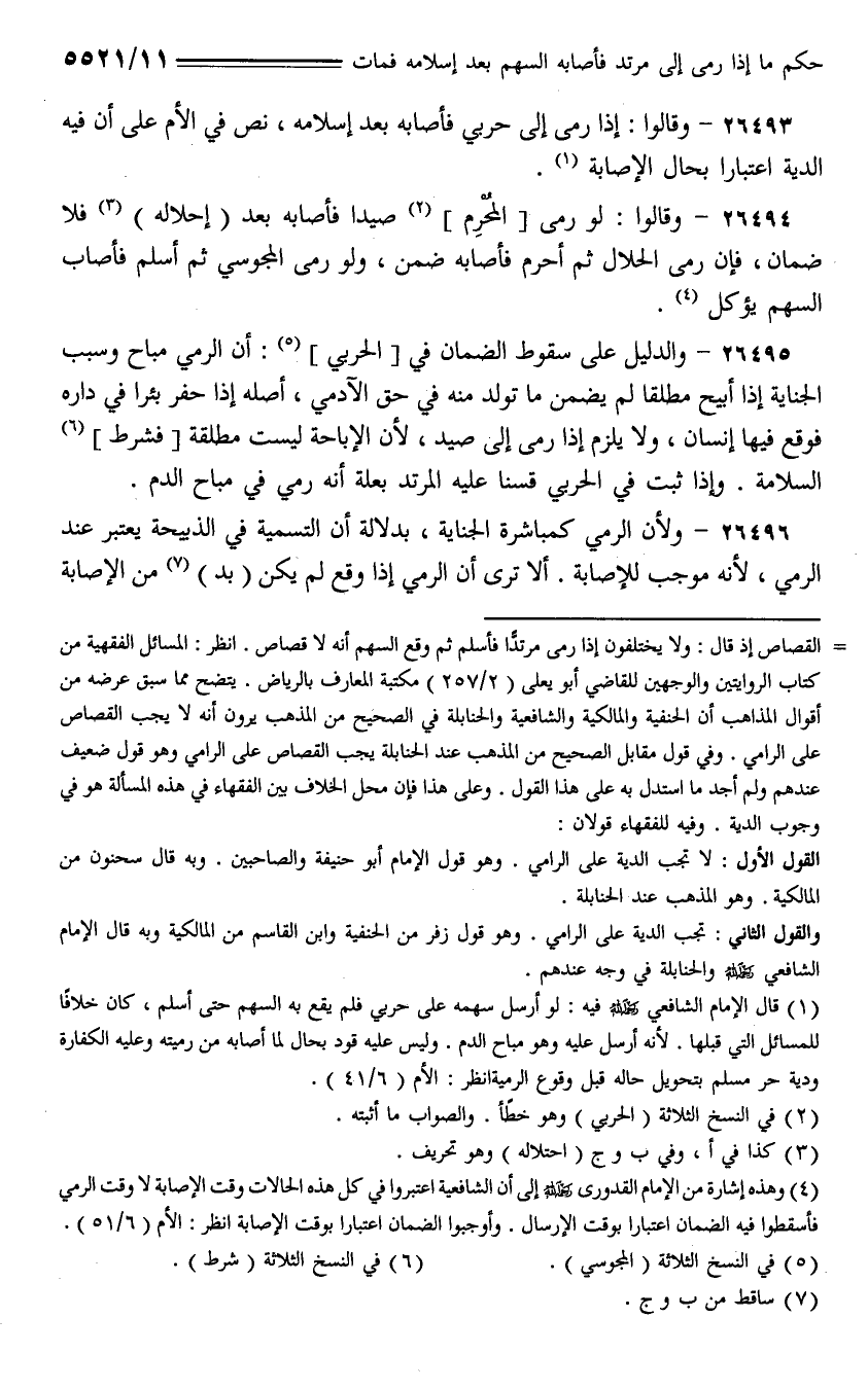 26493 - وقالوا: إذا رمى إلى حربي فأصابه بعد إسلامه، نص في الأم على أن فيه الدية اعتبارًا بحال الإصابة.