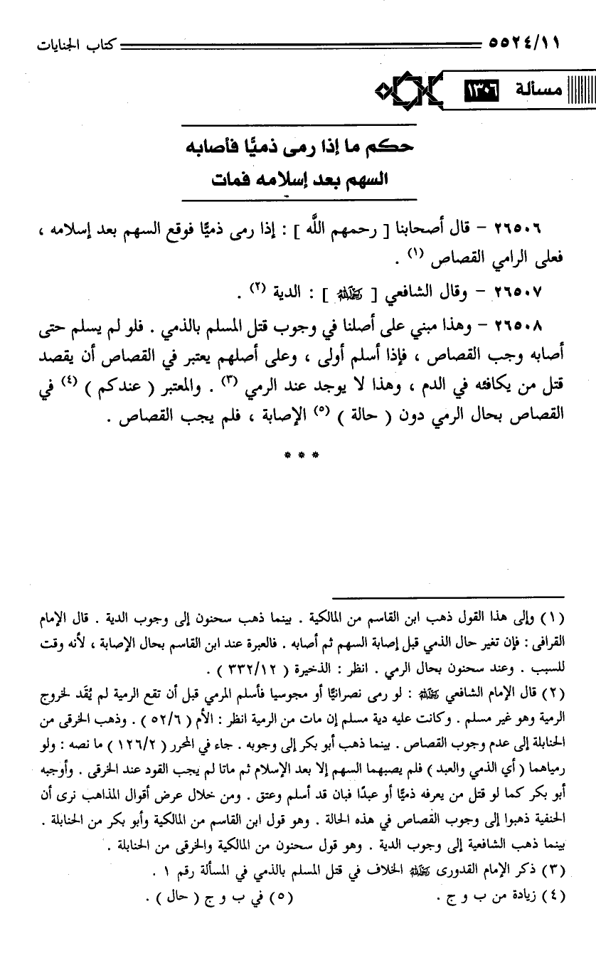 26506 - قال أصحابنا [رحمهم الله]: إذا رمى ذميًا فوقع السهم بعد إسلامه، فعلى الرامي القصاص.