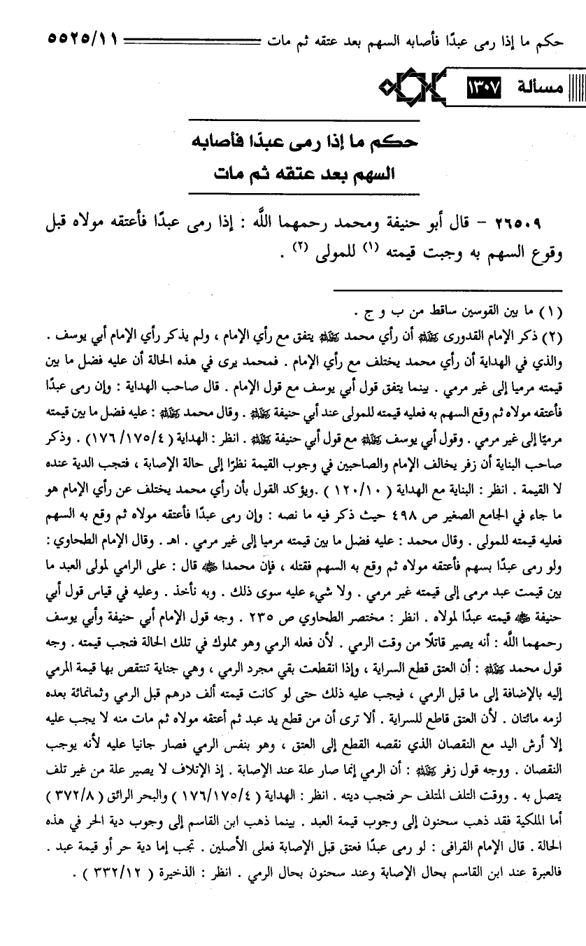 26509 - قال أبو حنيفة ومحمد رحمهما الله: إذا رمى عبدًا فأعتقه مولاه قبل وقوع السهم به وجب قيمته للمولى.