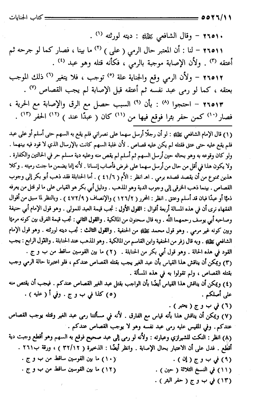 26513 - احتجوا: بأن السبب حصل مع الرق والإصابة مع الحرية فصار كمن حفر بئرًا فوقع فيها من كان (عبدًا عند) الحفر.