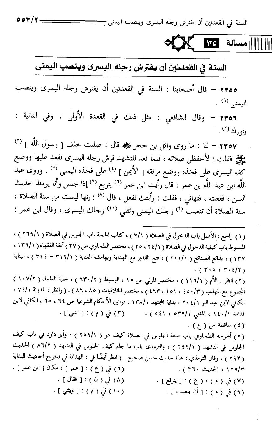 2355 - قال أصحابنا: السنة في القعدتين أن يفترش رجله اليسر وينصب اليمنى.