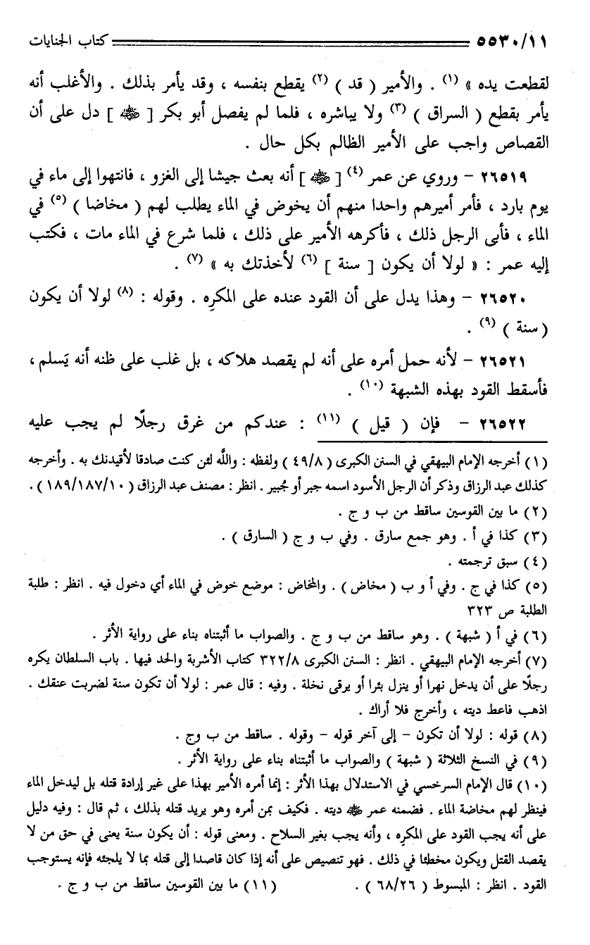 26519 - وروي عن عمر [- رضي الله عنه -] أنه بعث إلى الغزو، فانتهوا إلى ماء في يوم بارد، فأمر أميرهم واحدًا منهم أن يخوض في الماء يطلب لهم (مخاضًا) في الماء، فأبى الرجل ذلك، فأكرهه الأمير على ذلك، فلما شرع في الماء مات، فكتب إليه عمر: «لولا أن يكون [سنة] لأخذتك به».