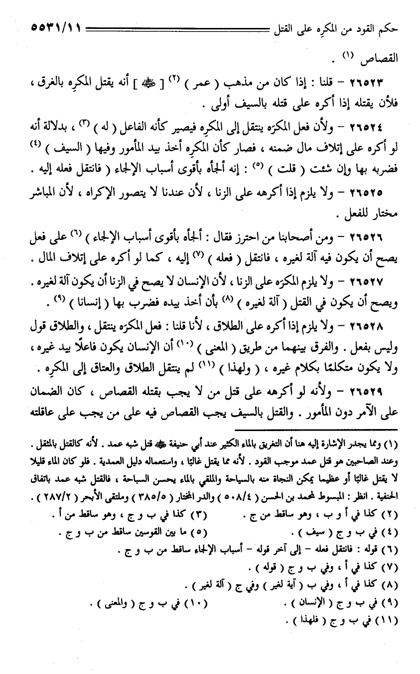 26529 - ولأنه لو أكرهه على قتل من لا يجب بقتله القصاص، كان الضمان على الآمر دون المأمور. والقتل بالسيف يجب القصاص فيه على من يجب على قتله.