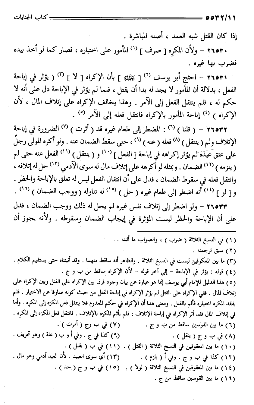 26531 - احتج أبو يوسف [رحمه الله] بأن الإكراه [لا] (يؤثر في إباحة الفعل، بدلالة أن المأمور لا يجد له بدًا أن يقتل، فلما لم يؤثر في الإباحة دل على أنه لا حكم له، فلم ينتقل الفعل إلى الآمر. وهذا يخالف الإكراه على إتلاف المال، لأن الإكراه) إباحة المأمور بالإكراه فانتقل فعله إلى الآمر.